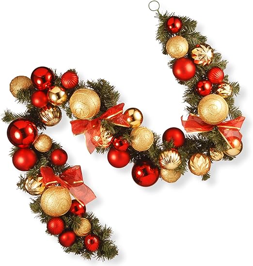 Designed with an Evergreen branch base, this artificial Christmas garland is 9 feet long and decorated with ball ronaments and ribbon bows.