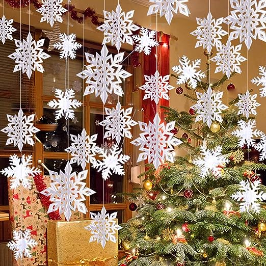 OuMuaMua Winter Christmas Hanging Snowflake Decorations, 12PCS Snowflakes Garland & 12PCS 3D Glittery Large White Snowflake for Christmas Winter Wonderland Holiday New Year Party Home Decorations